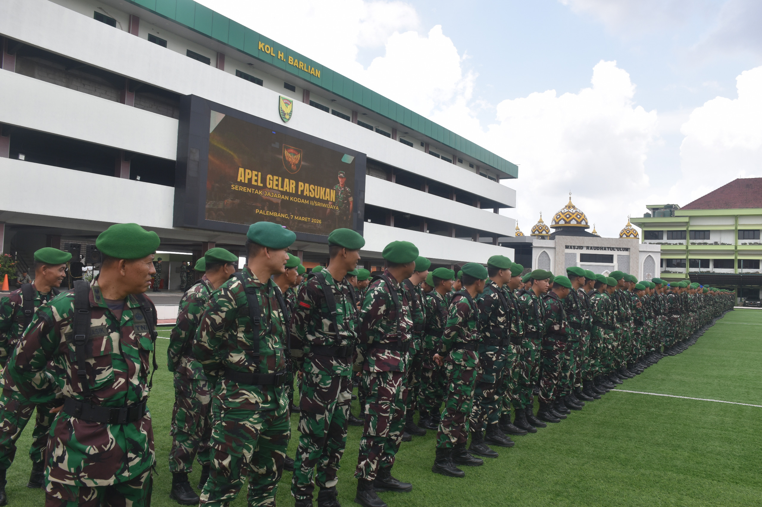 lintassumsel.com_Asisten Operasi Kasdam II/Sriwijaya, Kolonel Inf Rony Fitriyanto, S.Sos., memimpin Apel Gelar Pasukan di lapangan Apel Makodam II/Sriwijaya, Palembang, Sabtu (07/03/2026). Kegiatan ini, dilaksanakan secara serentak oleh seluruh satuan di jajaran Kodam II/Sriwijaya guna memastikan kesiapan personel dalam menghadapi dinamika situasi keamanan terkini._