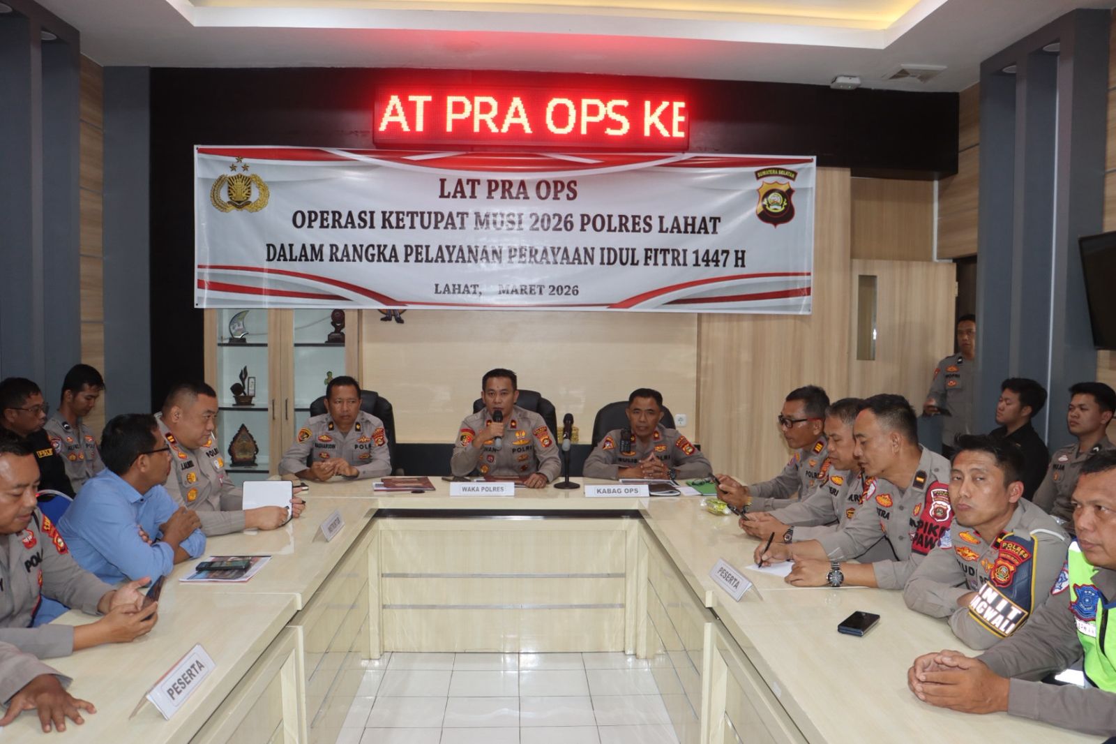 Lahat, lintas sumsel.com pada hari selasa (10/03/ 2026), Kapolres Lahat AKBP Novi Edyanto SIK.MIK, yang di dampingi Waka Polres Kompol Liswan Nurhapis SH, Kabag Ops Kompol Sulis Pujiono SH, Kabag Log Kompol Nasharuddin SH.MH, membuka dan memimpin giat Lat Pra Ops Ketupat Musi 2026 dalam Rangka Pelayanan Perayaan Idul Fitri 1447 H.Latihan Pra Ops merupakan bagian penting dari upaya meningkatkan kesiapan personel dalam mengamankan perayaan Hari Raya Idul Fitri1447 H, tahun 2026. Kegiatan ini bertujuan untuk memberikan pemahaman menyeluruh kepada seluruh personel mengenai cara bertindak, prosedur pengamanan, serta strategi pelayanan kepada masyarakat selama masa arus mudik dan arus balik.